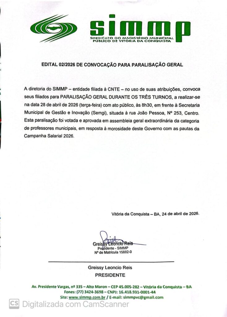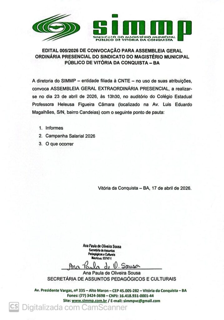 Edital 001/2024 de convocação para Assembleia Geral Ordinária Presencial do Sindicato do Magistério Municipal Público de Vitória da Conquista